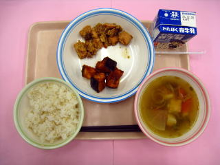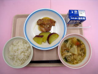 麦ご飯・鶏のジューシー照り焼き・さつまいものさわやか煮・かぶと油揚げの味噌汁・牛乳