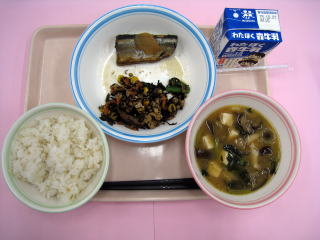 麦ご飯・秋刀魚の生姜煮・鉄分たっぷり七色煮・秋の味噌汁・牛乳