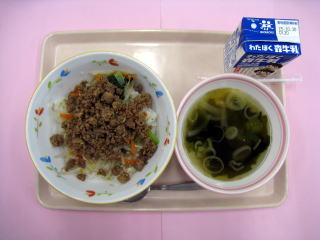 ・麦ご飯・のりの佃煮・新じゃがのそぼろ煮・けんちん汁・牛乳