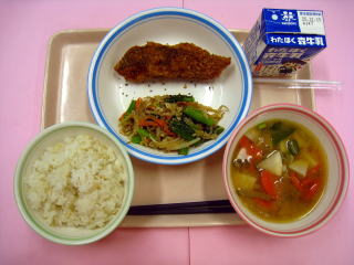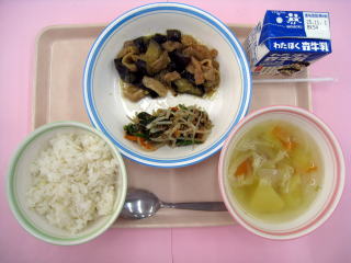 麦ご飯・豚なすピーマンの味噌炒め・野菜ゴロゴロスープ・牛乳