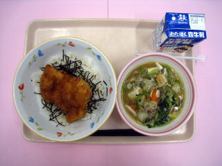 ・東松山の焼き鳥丼・まゆ玉汁・牛乳