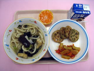 とろろ昆布うどん・れんこんの秘密揚げ・紅きんぴら・菊花みかん・牛乳