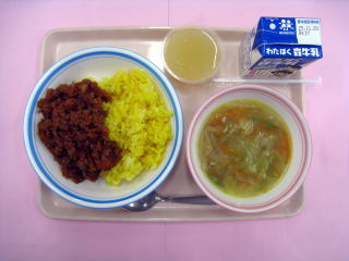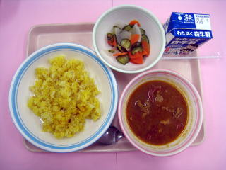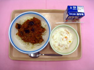 カボチャのキーマカレー・果物たっぷりヨーグルトサラダ・牛乳