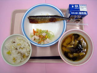 さつまいもご飯・秋刀魚の塩焼き・鶏ささみのコールスローサラダ・きのこ汁・牛乳