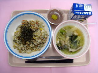 戻り鰹と生姜のご飯・里芋と白菜の味噌汁・菊花みかん・牛乳