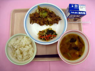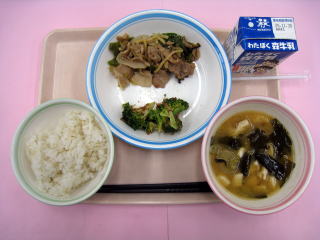 麦ご飯・じゃがいものチンジャオロース・ブロッコリーのおかかポン酢和え・豆腐とわかめの味噌汁・牛乳