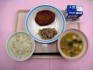 麦ご飯・ギョロッケ、無限もやし・ぽかぽか味噌汁・牛乳