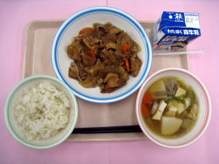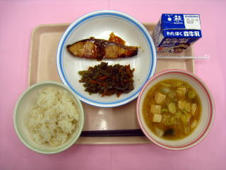 麦ご飯・ぶりの照り焼き・はじめてきんぴら(ヤーコンのきんぴら)・冬野菜の味噌汁・牛乳