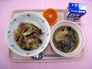 中華丼・手作りワンタンスープ・菊花みかん・牛乳