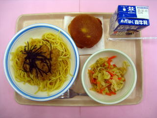 練馬区のさわやかスパゲティ・マスタードサラダ・手作りミニビスキュイパン・牛乳