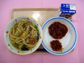 しっぽくうどん・秘密のてんぷら(金時豆の天ぷら)・味噌豆・牛乳