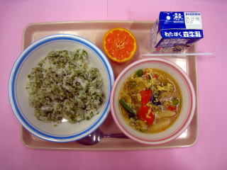 青のりご飯・韓国風卵雑煮・菊花みかん・牛乳