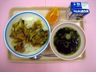 豚キムチ丼・わかめスープ・紅マドンナ・牛乳