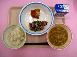 ・麦ご飯・鯵のから揚げ・塩昆布和え・川島呉汁・牛乳
