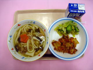 さくらけんうどん・白菜のかき揚げ・かっぱの漬物・牛乳