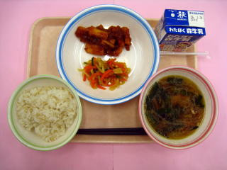 麦ご飯・くじらの竜田揚げ・かくや・野菜たっぷり味噌汁・牛乳