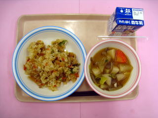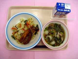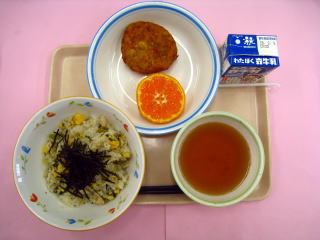 秋のガーリックピラフ・おだんごスープ・菊花みかん・牛乳