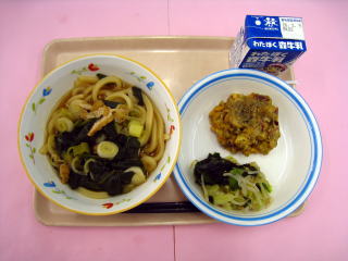 きつねうどん・岩石揚げ・おひたし・牛乳