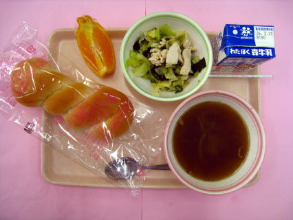 ツイストパン・チキンと海藻のサラダ・オニオンスープ・パングラタン・デコポン・牛乳